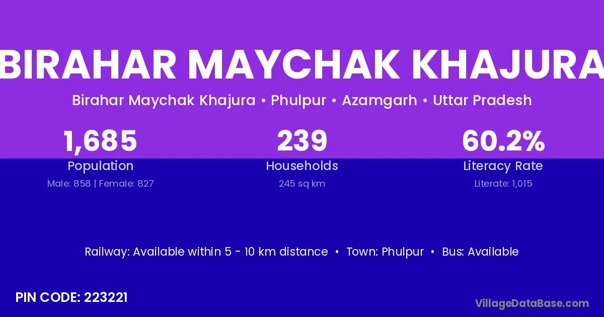Birahar Maychak Khajura village has a total population of 1,685 people, of which 858 are males and 827 are females.