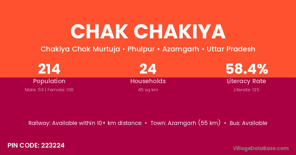 Chak Chakiya village has a total population of 214 people, of which 114 are males and 100 are females.