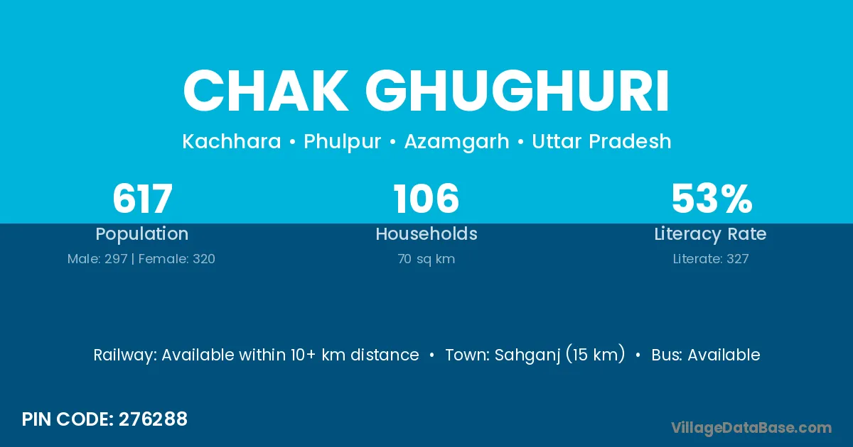 Chak Ghughuri village has a total population of 617 people, of which 297 are males and 320 are females.