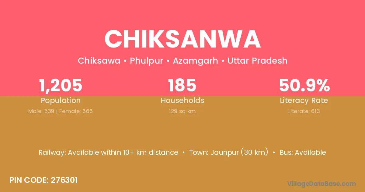 Jaunpur (30 km) is the nearest town to Chiksanwa village for major economic activities and is located approximately 30 km away.