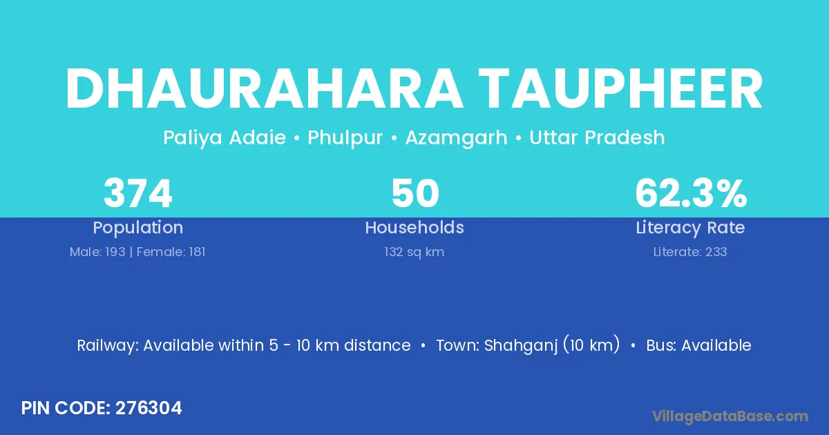 Shahganj (10 km) is the nearest town to Dhaurahara Taupheer village for major economic activities and is located approximately 10 km away.