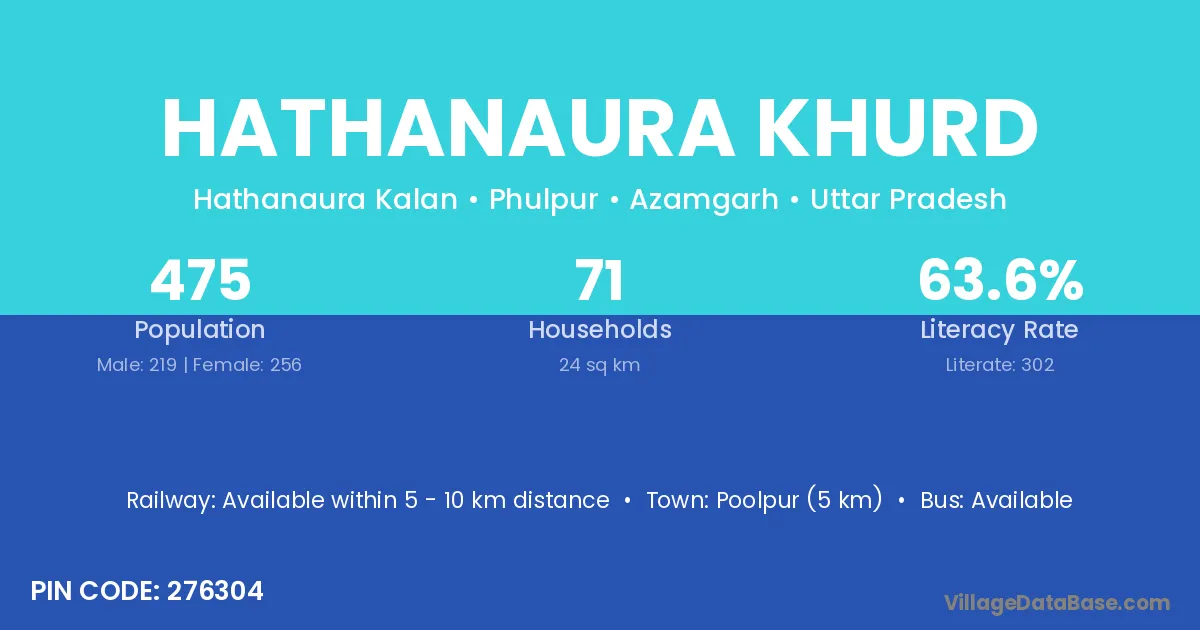 Poolpur (5 km) is the nearest town to Hathanaura Khurd village for major economic activities and is located approximately 5 km away.