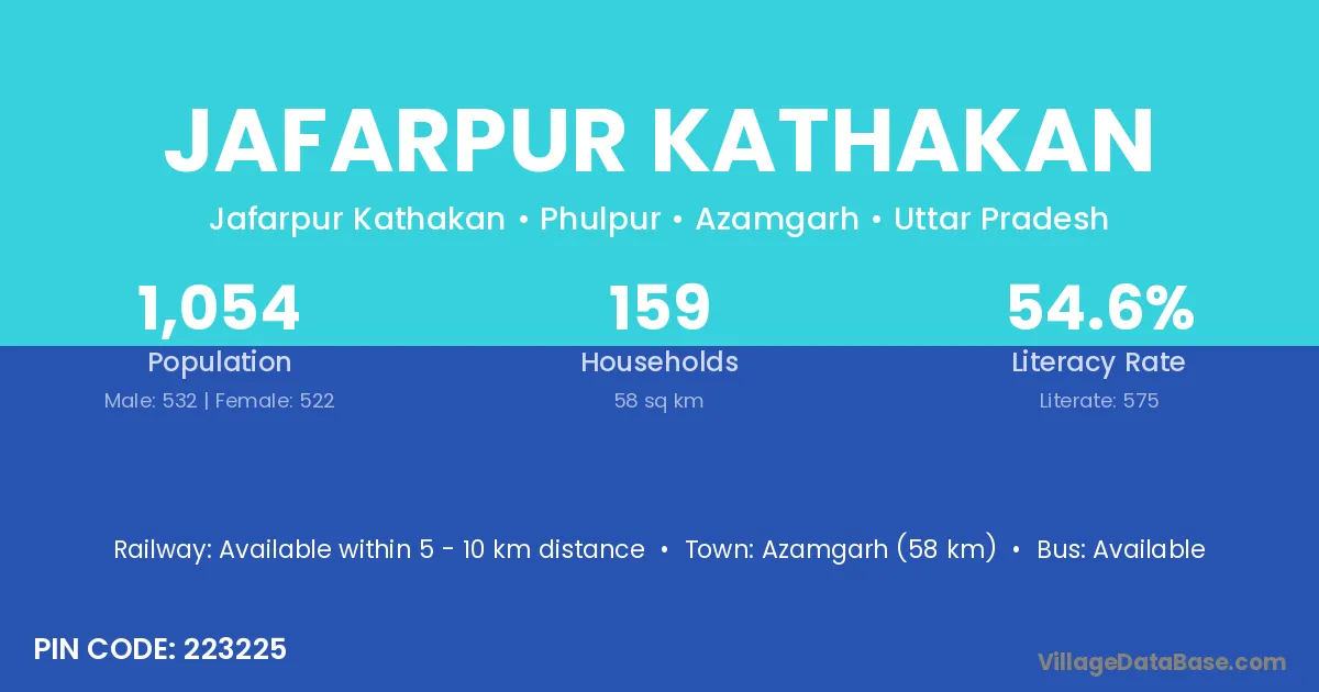 Azamgarh (58 km) is the nearest town to Jafarpur Kathakan village for major economic activities and is located approximately 58 km away.