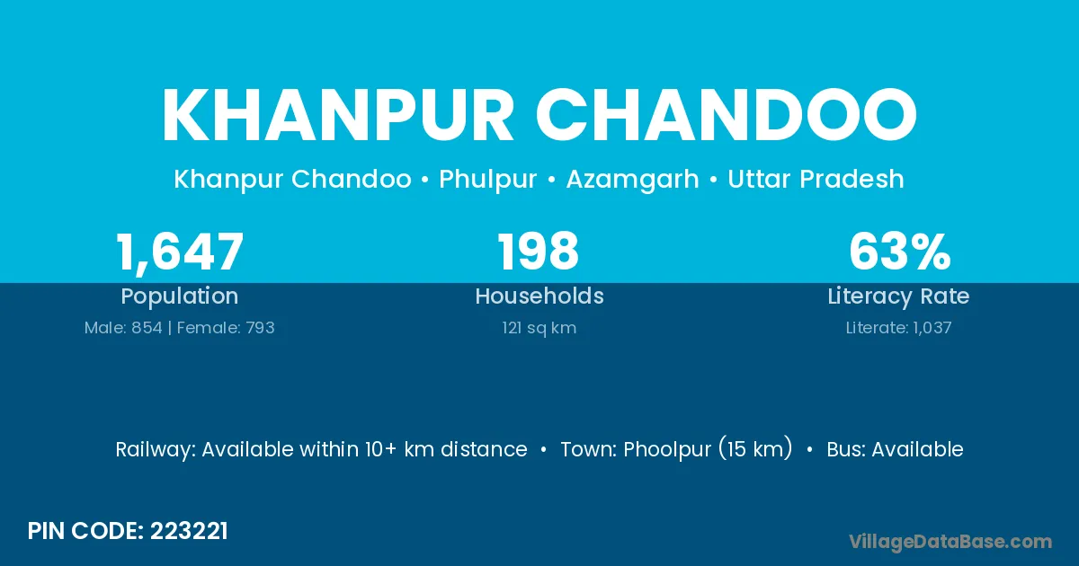 Phoolpur (15 km) is the nearest town to Khanpur Chandoo village for major economic activities and is located approximately 15 km away.