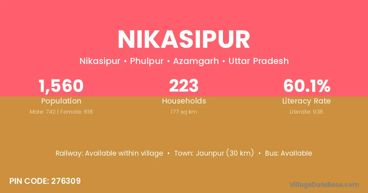 Jaunpur (30 km) is the nearest town to Nikasipur village for major economic activities and is located approximately 30 km away.