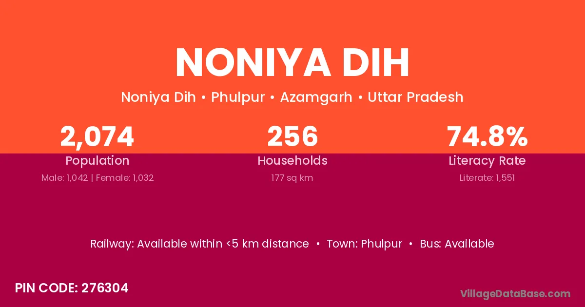 Noniya Dih village has a total population of 2,074 people, of which 1,042 are males and 1,032 are females.