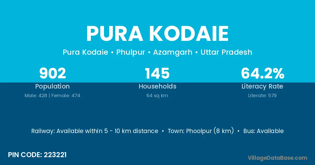 Phoolpur (8 km) is the nearest town to Pura Kodaie village for major economic activities and is located approximately 8 km away.