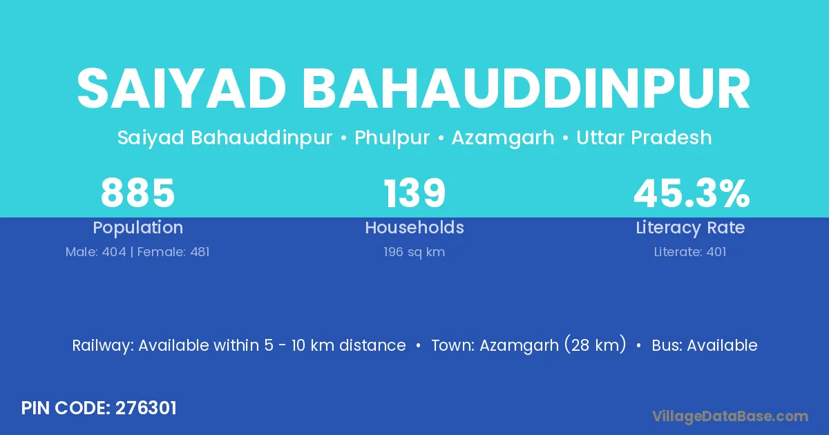 Azamgarh (28 km) is the nearest town to Saiyad Bahauddinpur village for major economic activities and is located approximately 28 km away.