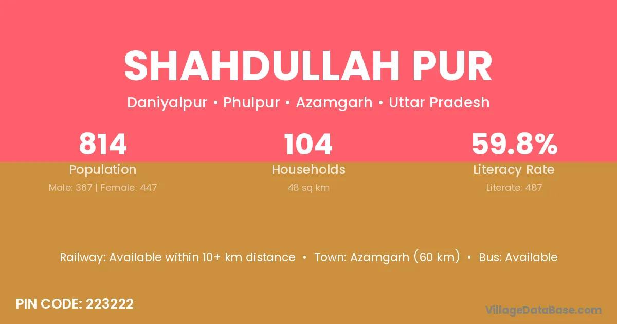 Azamgarh (60 km) is the nearest town to Shahdullah Pur village for major economic activities and is located approximately 60 km away.