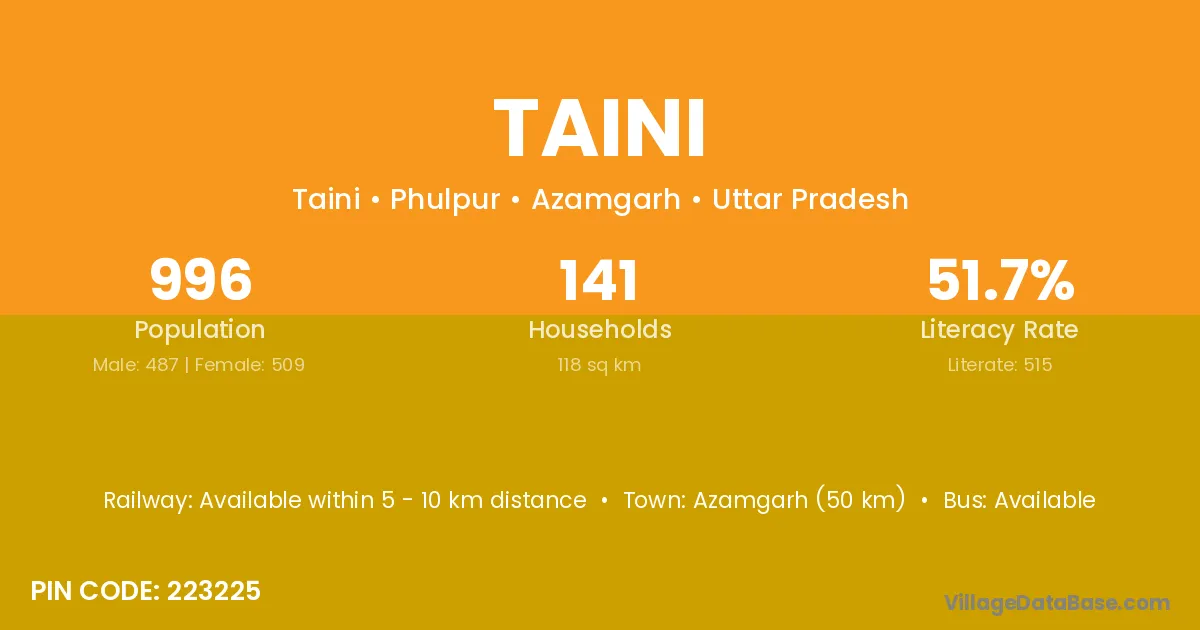 Azamgarh (50 km) is the nearest town to Taini village for major economic activities and is located approximately 50 km away.