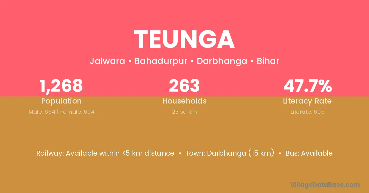 The literacy rate of Teunga village is 63.80%. Male literacy stands at 67.27% and female literacy at 60.61%.