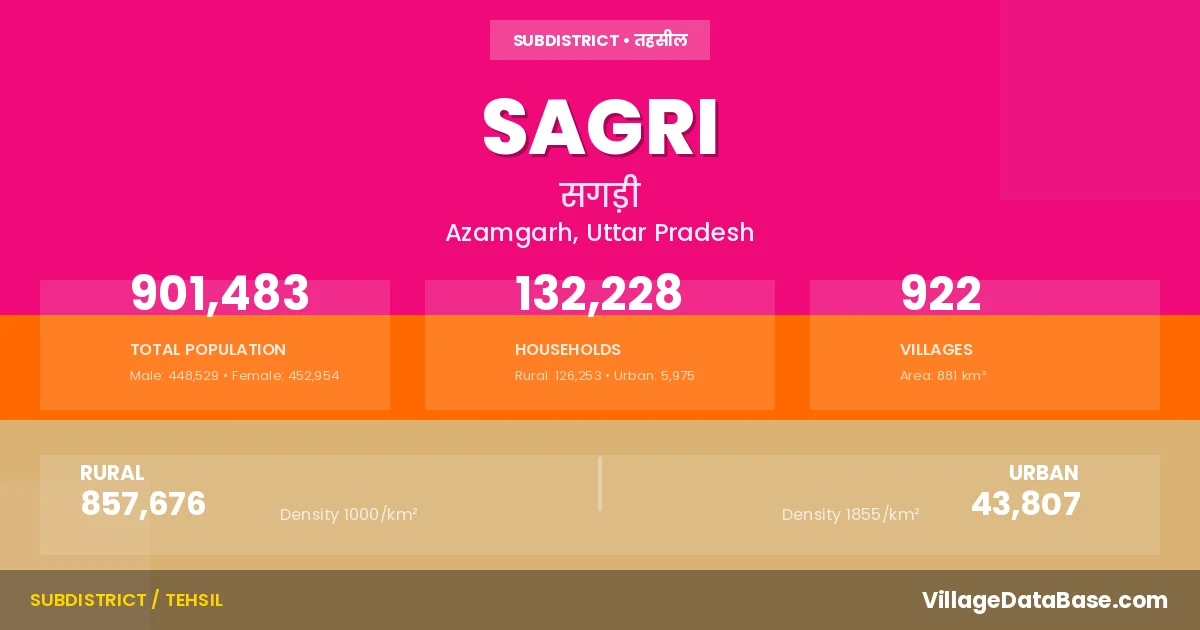 According to the 2011 census The total area of Sagri Tehsil is 881 km², with a population of 901483 people. The population density is 1,023 inhabitants per square kilometre, and there are approximately 132228 houses in the sub district.