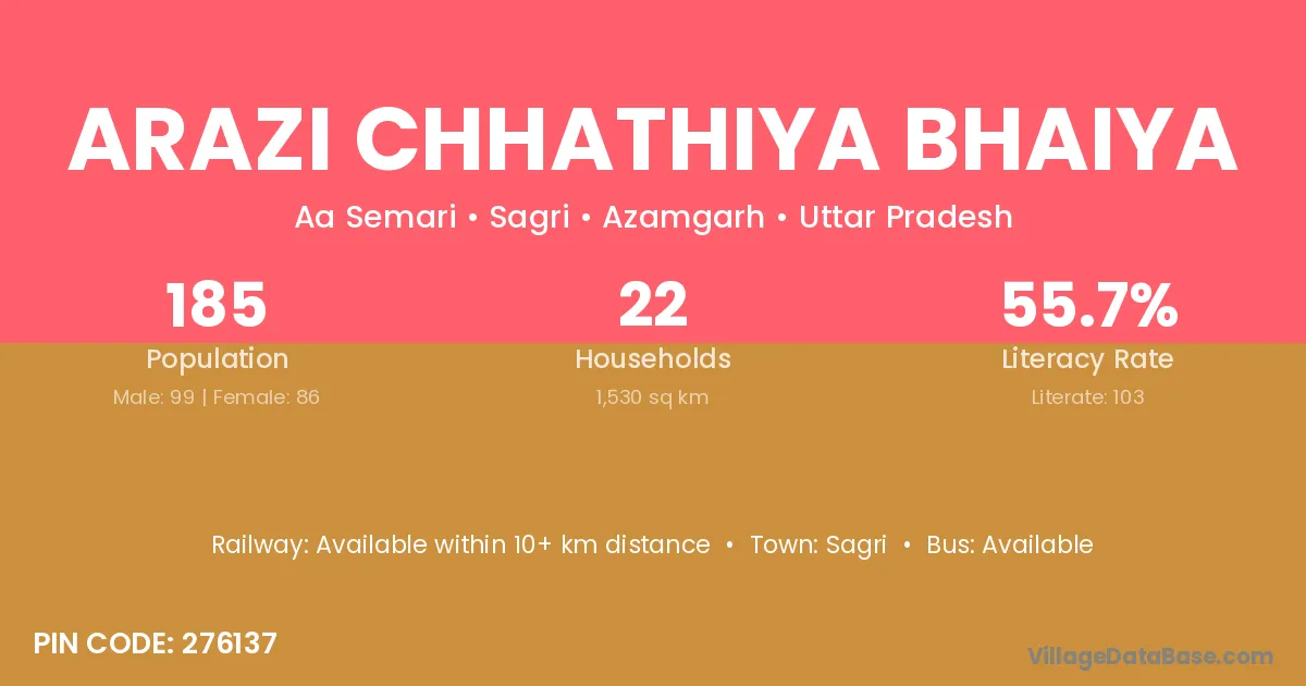 Arazi Chhathiya Bhaiya village has a total population of 185 people, of which 99 are males and 86 are females.