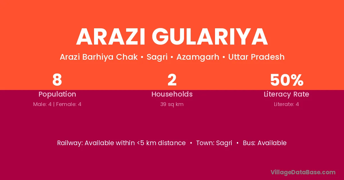 Arazi Gulariya village has a total population of 8 people, of which 4 are males and 4 are females.