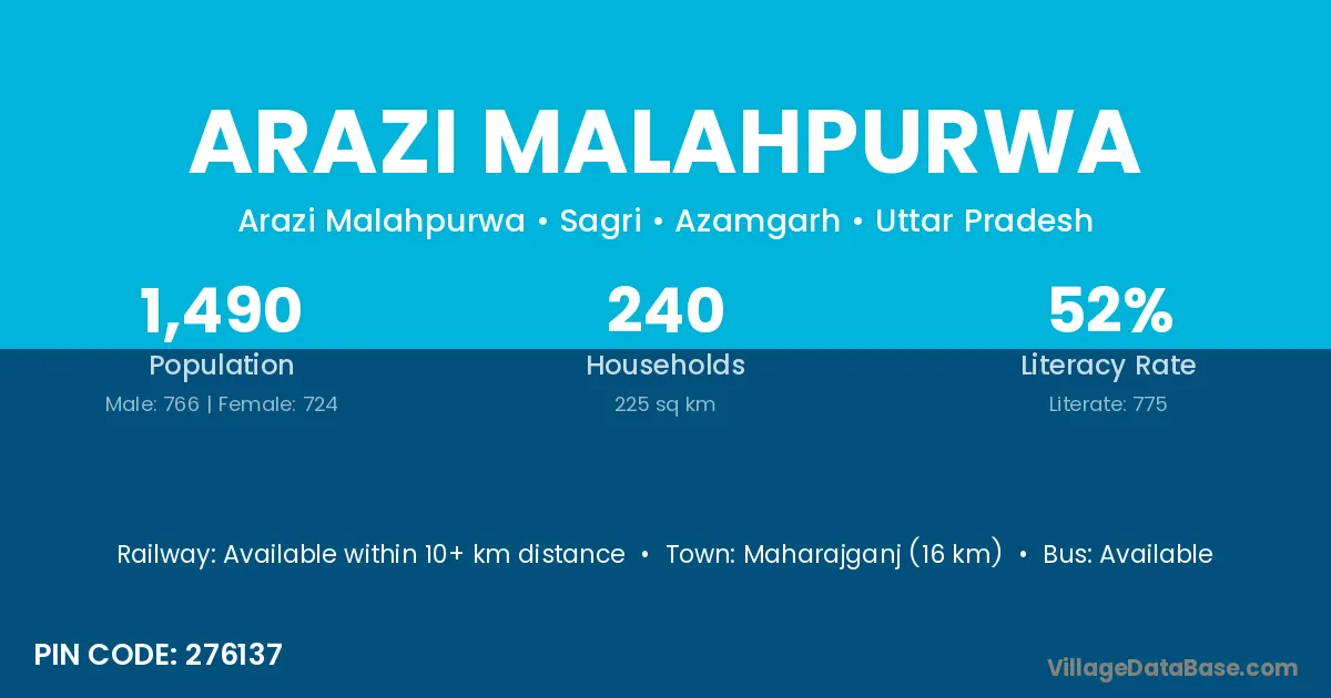Maharajganj (16 km) is the nearest town to Arazi Malahpurwa village for major economic activities and is located approximately 16 km away.