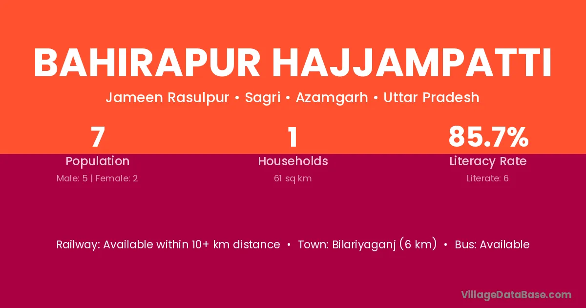 Bilariyaganj (6 km) is the nearest town to Bahirapur Hajjampatti village for major economic activities and is located approximately 6 km away.