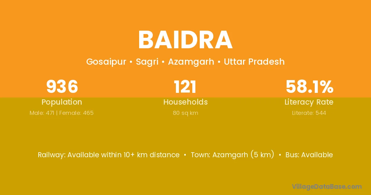 Azamgarh (5 km) is the nearest town to Baidra village for major economic activities and is located approximately 5 km away.