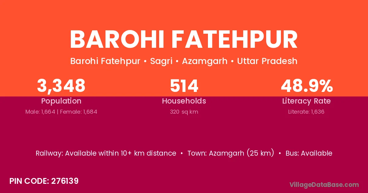 Azamgarh (25 km) is the nearest town to Barohi Fatehpur village for major economic activities and is located approximately 25 km away.