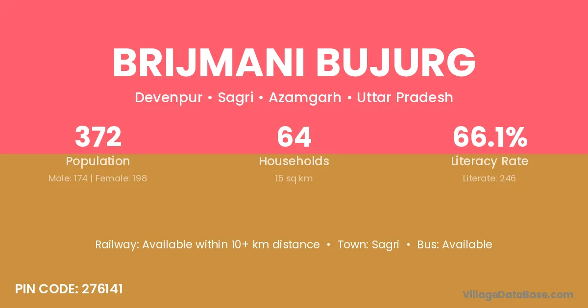 Brijmani Bujurg village has a total population of 372 people, of which 174 are males and 198 are females.