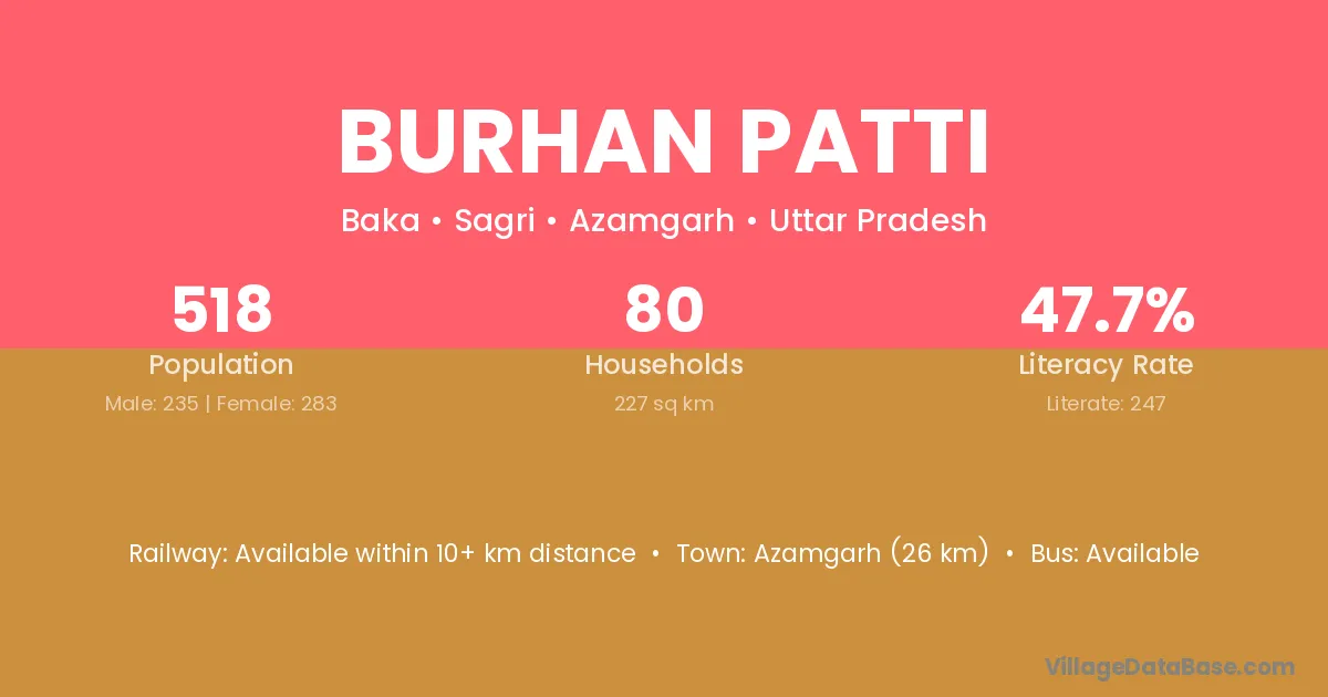 Azamgarh (26 km) is the nearest town to Burhan Patti village for major economic activities and is located approximately 26 km away.