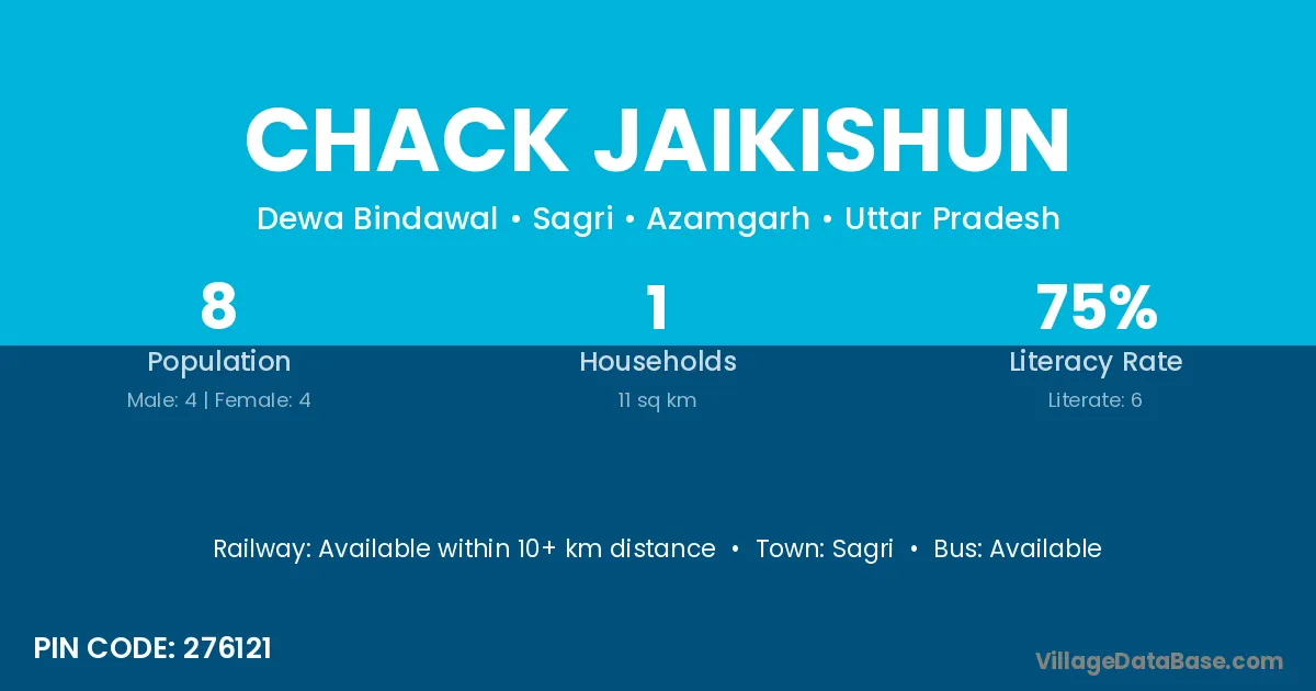 Chack Jaikishun village has a total population of 8 people, of which 4 are males and 4 are females.
