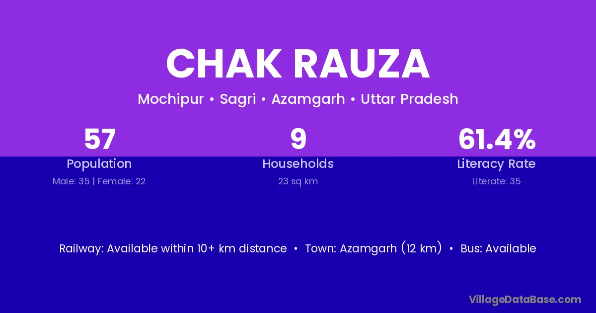 Azamgarh (12 km) is the nearest town to Chak Rauza village for major economic activities and is located approximately 12 km away.