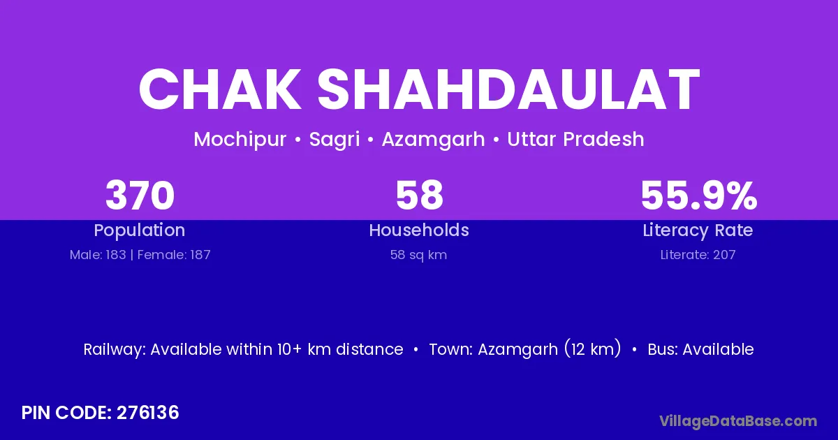 Azamgarh (12 km) is the nearest town to Chak Shahdaulat village for major economic activities and is located approximately 12 km away.