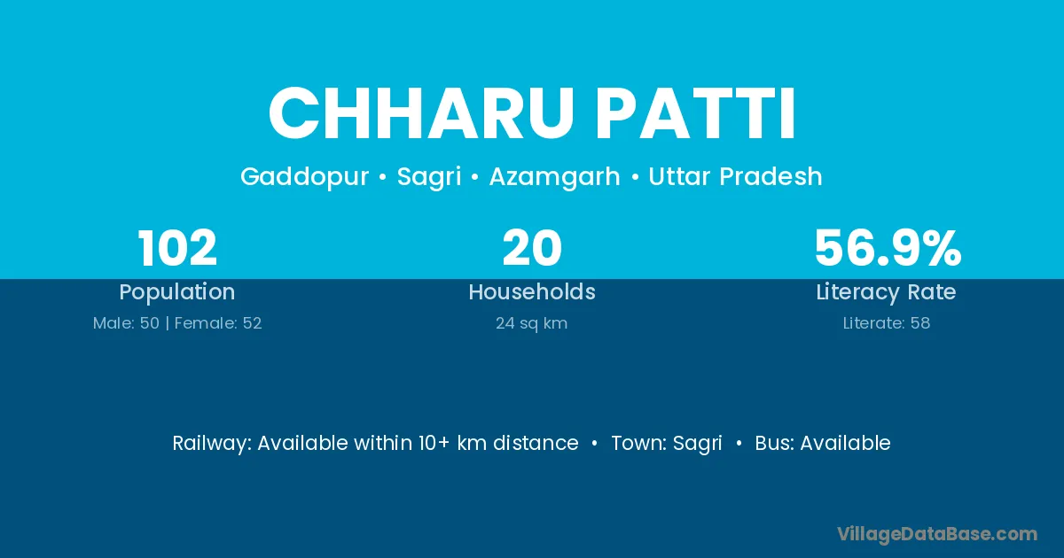 Chharu Patti village has a total population of 102 people, of which 50 are males and 52 are females.