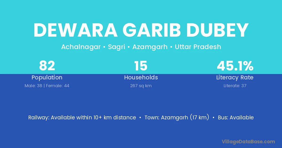 Azamgarh (17 km) is the nearest town to Dewara Garib Dubey village for major economic activities and is located approximately 17 km away.