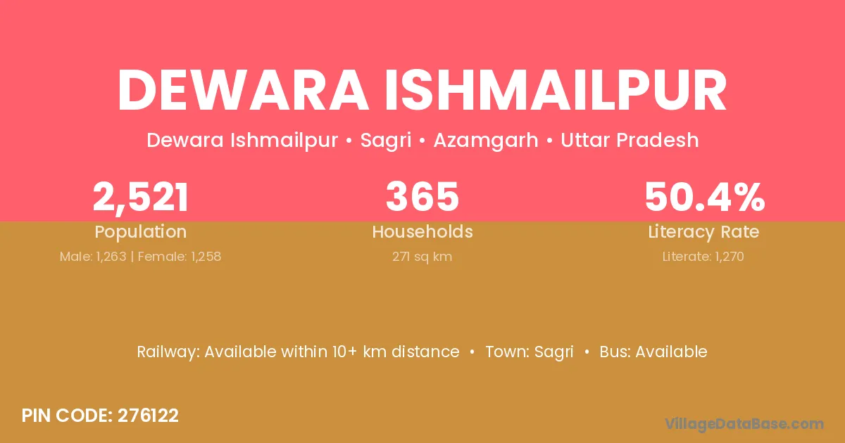 Dewara Ishmailpur village has a total population of 2,521 people, of which 1,263 are males and 1,258 are females.