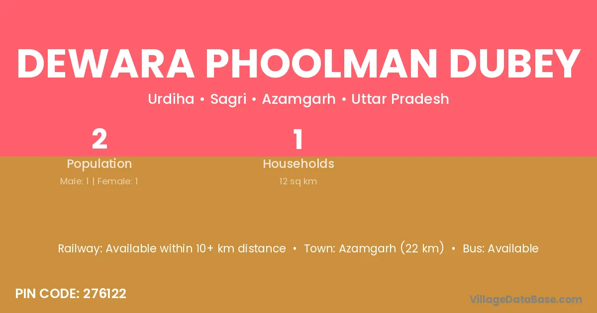 Azamgarh (22 km) is the nearest town to Dewara Phoolman Dubey village for major economic activities and is located approximately 22 km away.