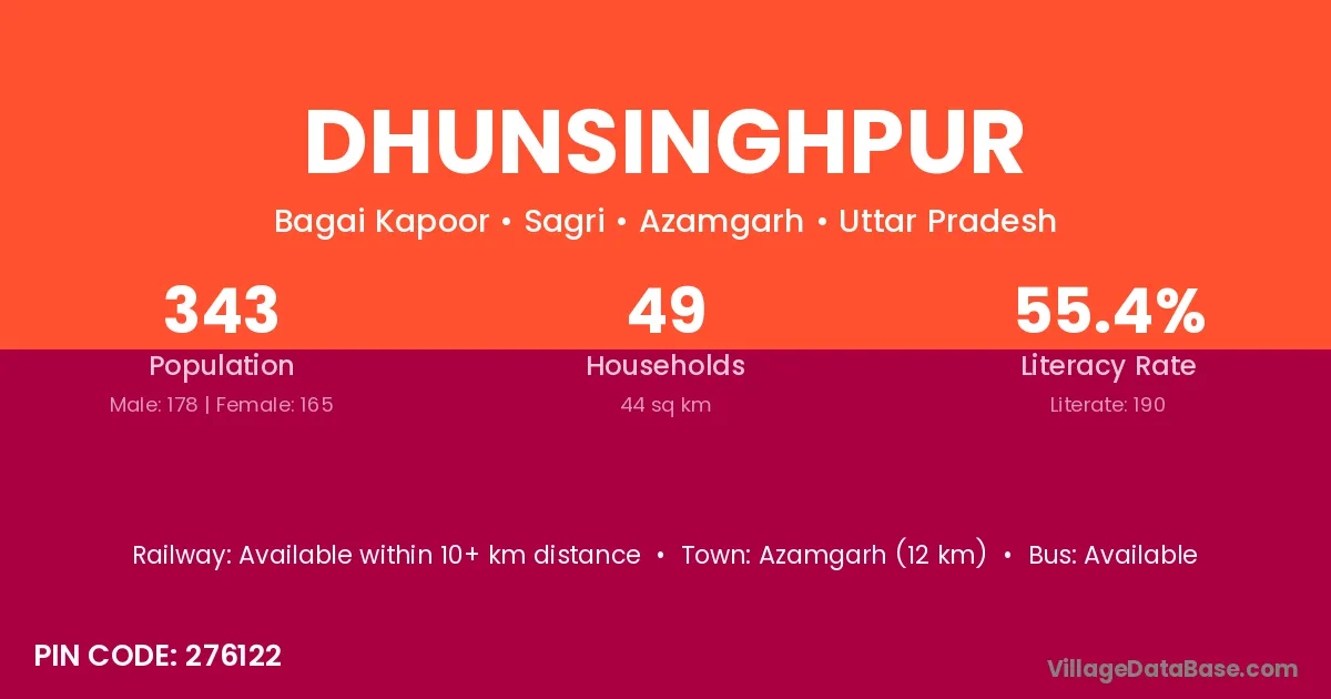 Azamgarh (12 km) is the nearest town to Dhunsinghpur village for major economic activities and is located approximately 12 km away.