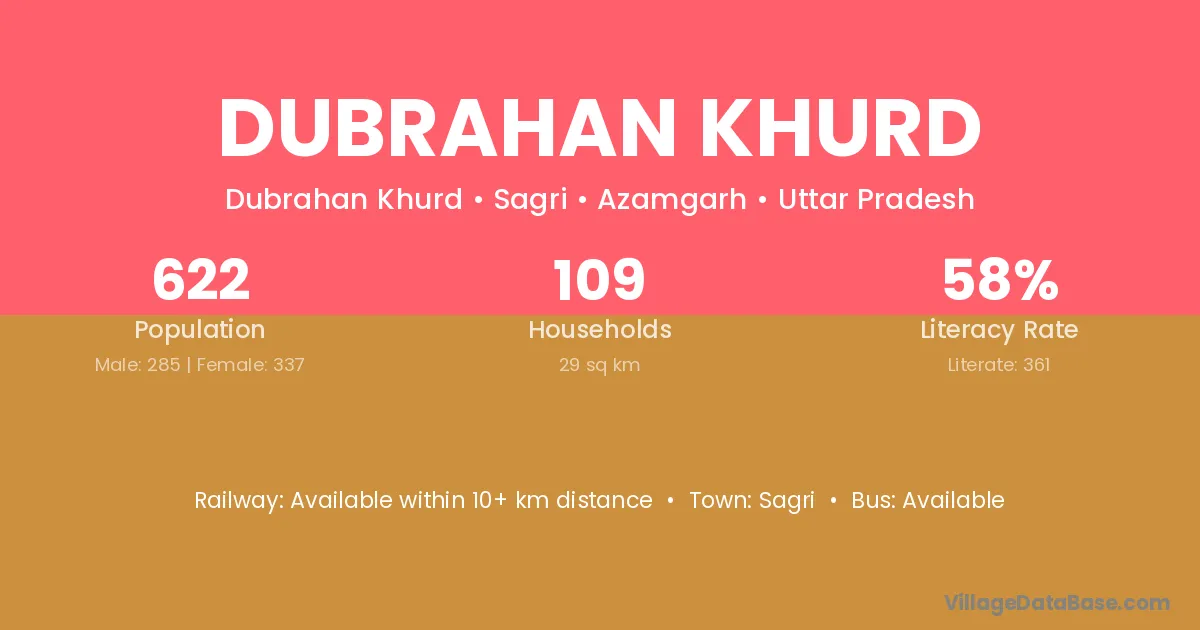 Dubrahan Khurd village has a total population of 622 people, of which 285 are males and 337 are females.