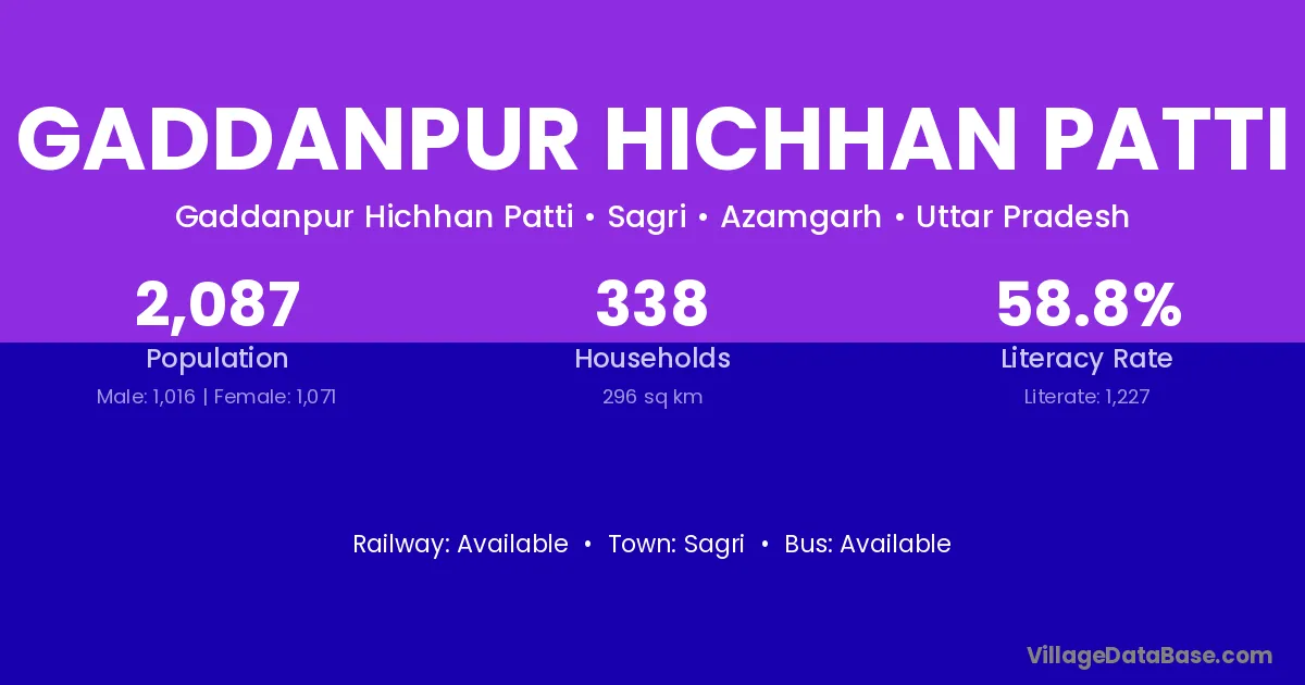 Gaddanpur Hichhan Patti village has a total population of 2,087 people, of which 1,016 are males and 1,071 are females.