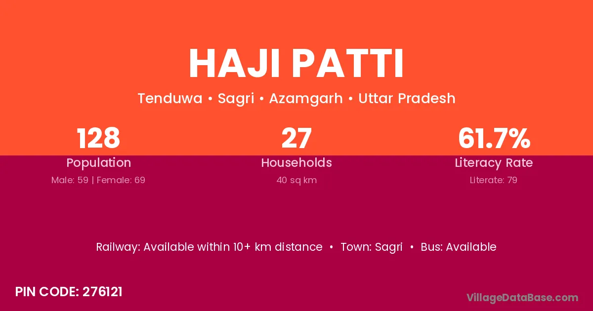 Haji Patti village has a total population of 128 people, of which 59 are males and 69 are females.