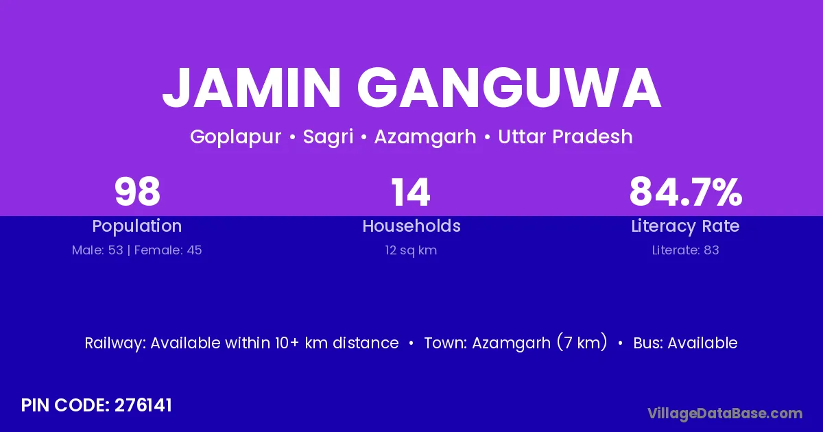 Azamgarh (7 km) is the nearest town to Jamin Ganguwa village for major economic activities and is located approximately 7 km away.