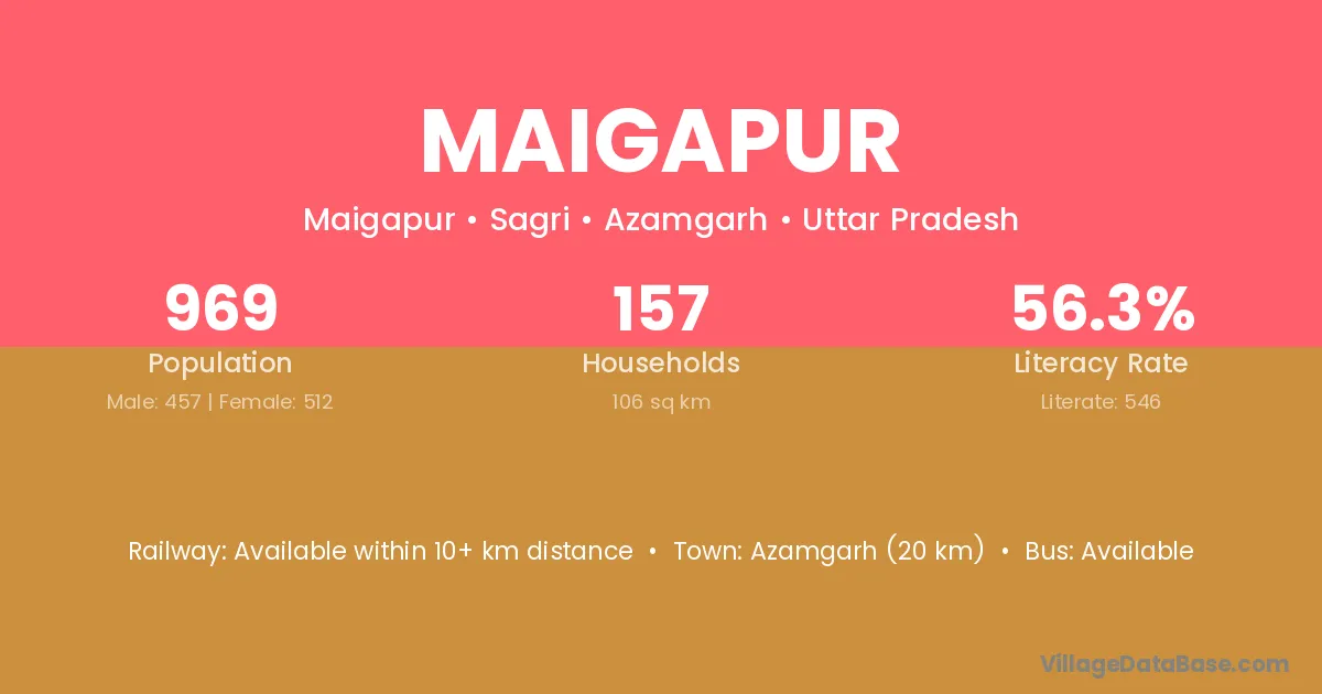 Azamgarh (20 km) is the nearest town to Maigapur village for major economic activities and is located approximately 20 km away.