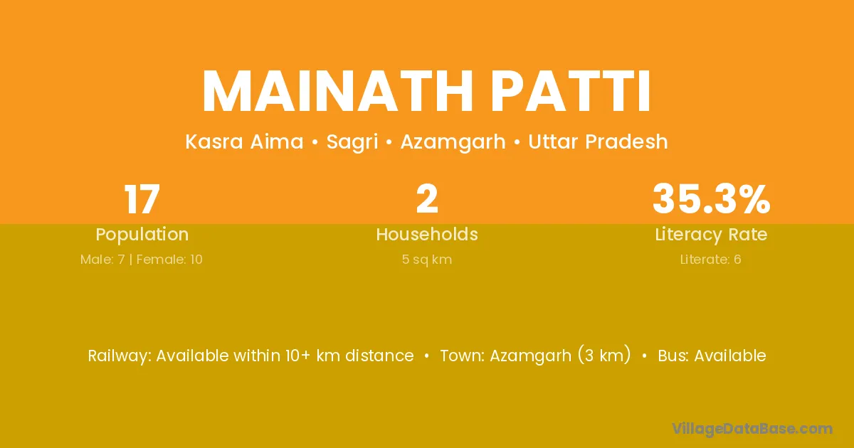 Azamgarh (3 km) is the nearest town to Mainath Patti village for major economic activities and is located approximately 3 km away.