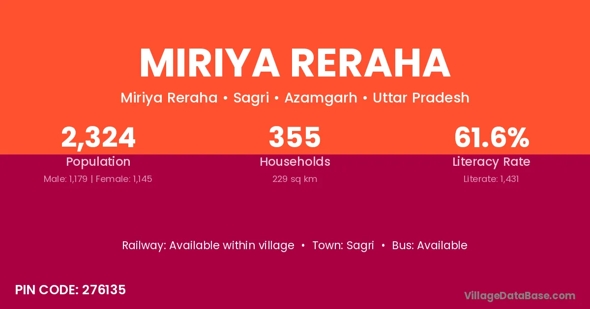 Miriya Reraha village has a total population of 2,324 people, of which 1,179 are males and 1,145 are females.