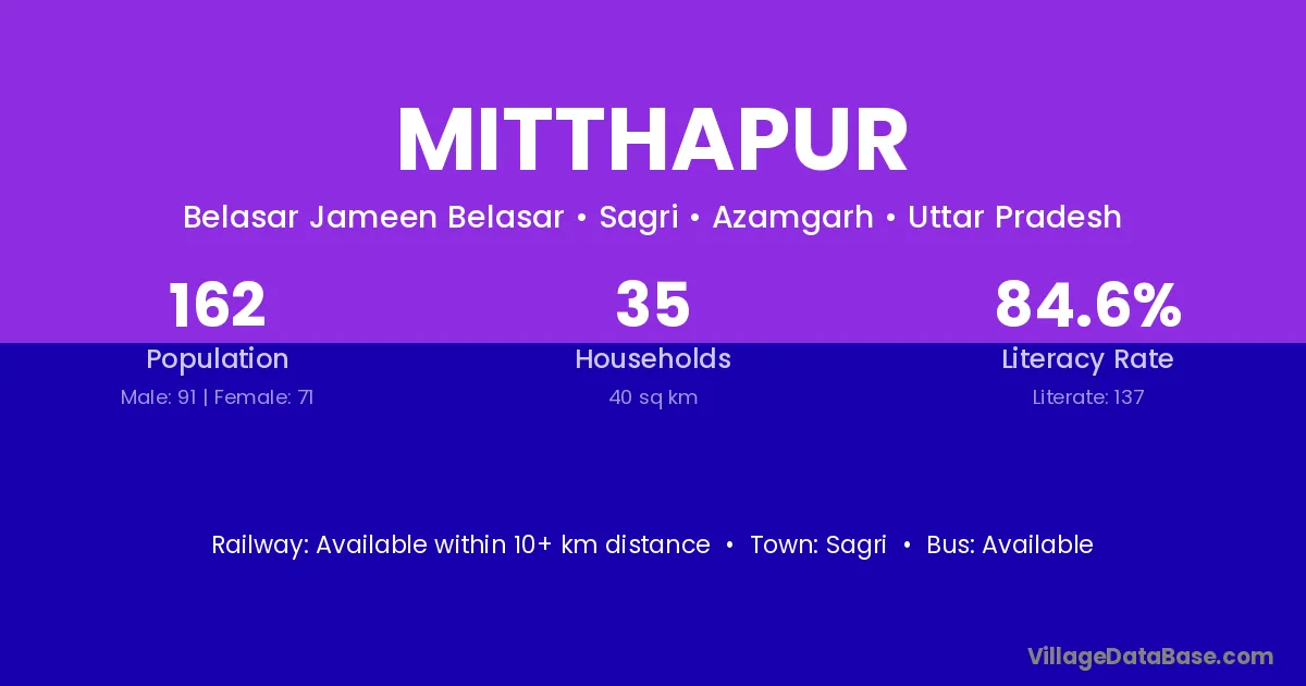 Mitthapur village has a total population of 162 people, of which 91 are males and 71 are females.