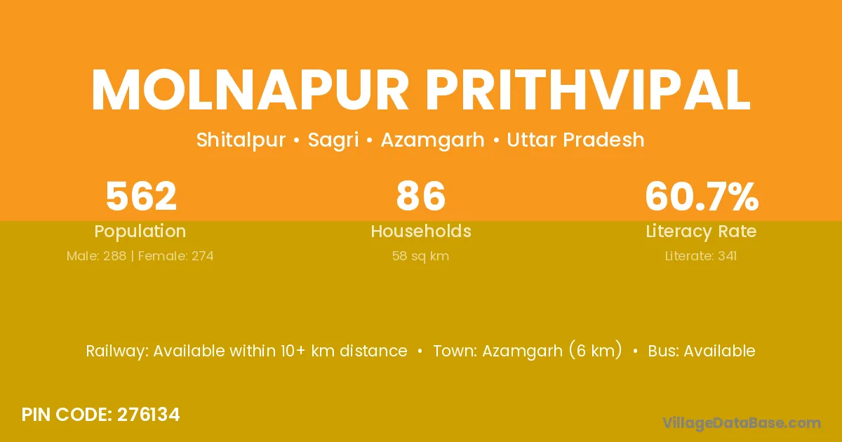 Azamgarh (6 km) is the nearest town to Molnapur Prithvipal village for major economic activities and is located approximately 6 km away.