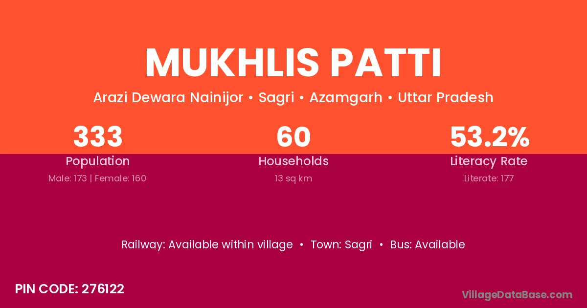 Mukhlis Patti village has a total population of 333 people, of which 173 are males and 160 are females.
