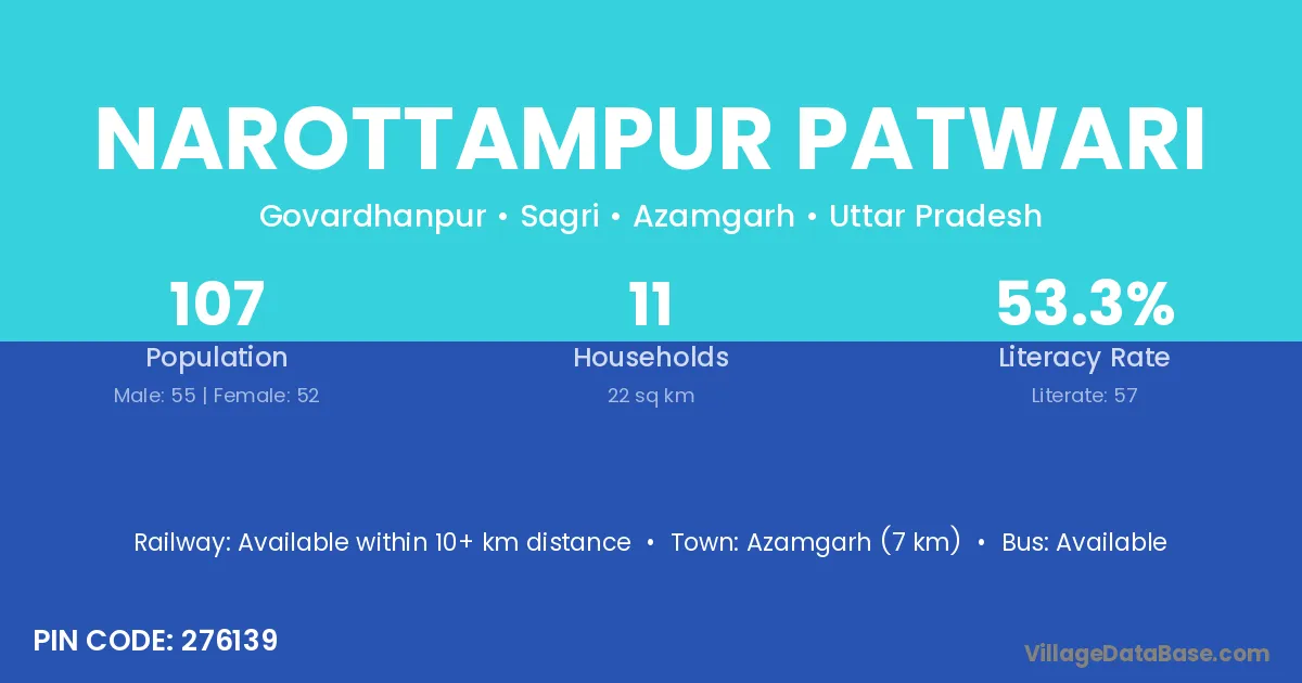 Azamgarh (7 km) is the nearest town to Narottampur Patwari village for major economic activities and is located approximately 7 km away.