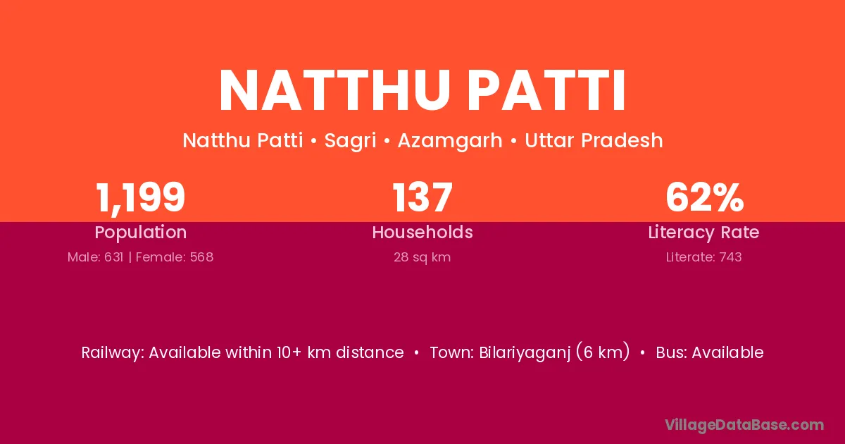 Natthu Patti village has a total population of 1,199 people, of which 631 are males and 568 are females.