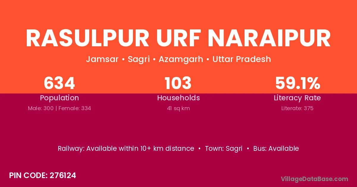Rasulpur Urf Naraipur village has a total population of 634 people, of which 300 are males and 334 are females.