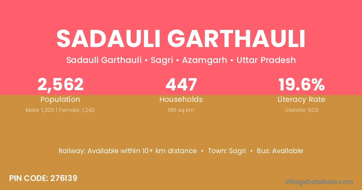 The literacy rate of Sadauli Garthauli village is 19.63%. Male literacy stands at 25.23% and female literacy at 13.69%.
