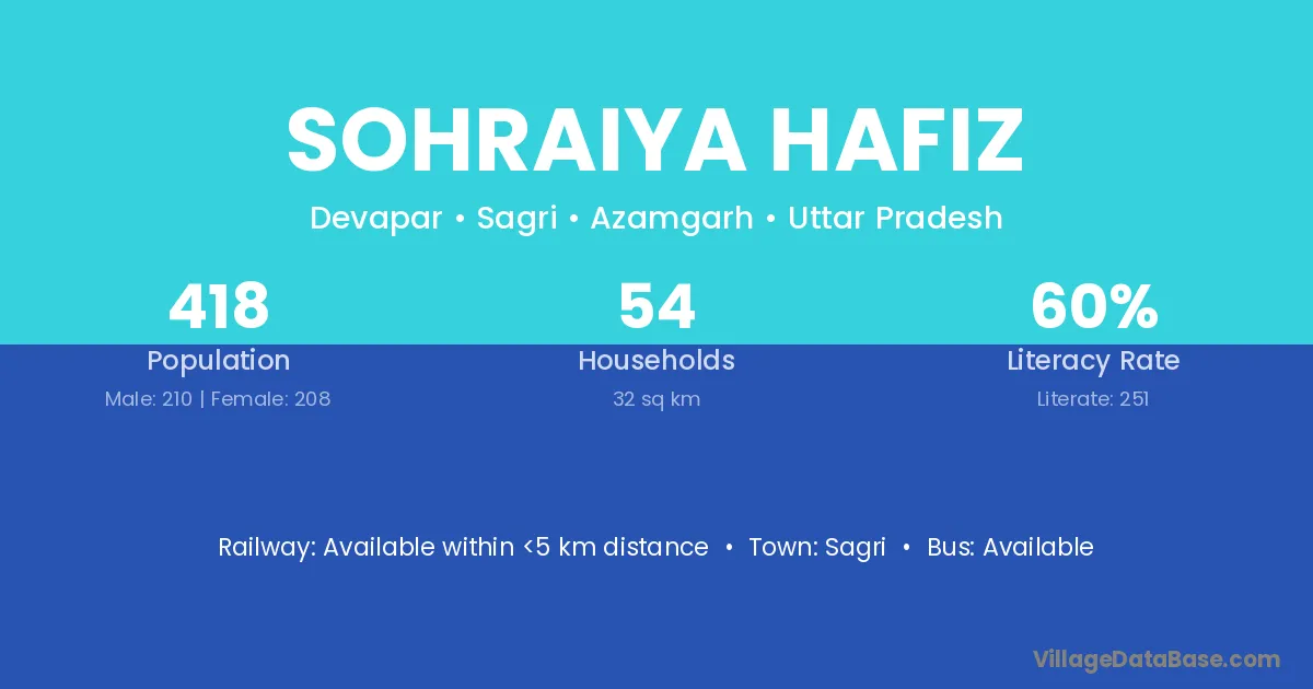 Sohraiya Hafiz village has a total population of 418 people, of which 210 are males and 208 are females.