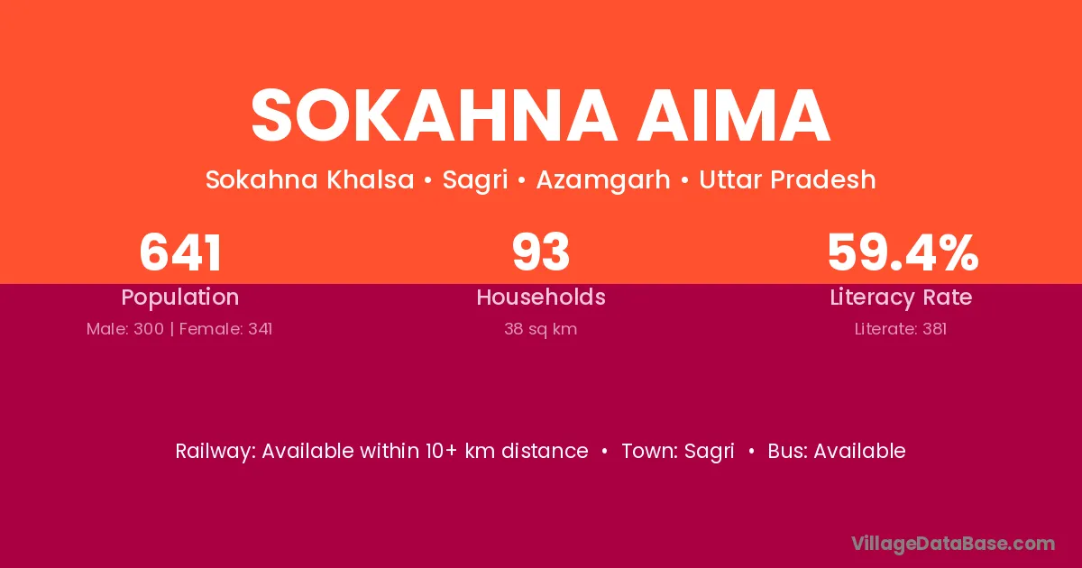 Sokahna Aima village has a total population of 641 people, of which 300 are males and 341 are females.