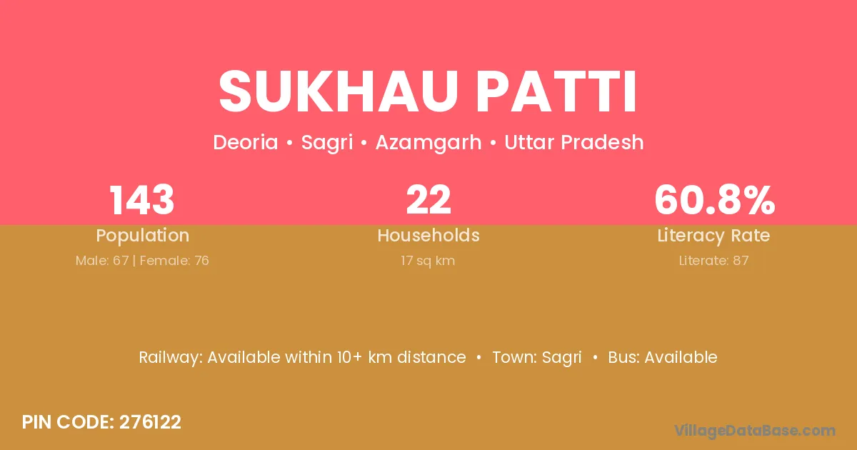 Sukhau Patti village has a total population of 143 people, of which 67 are males and 76 are females.