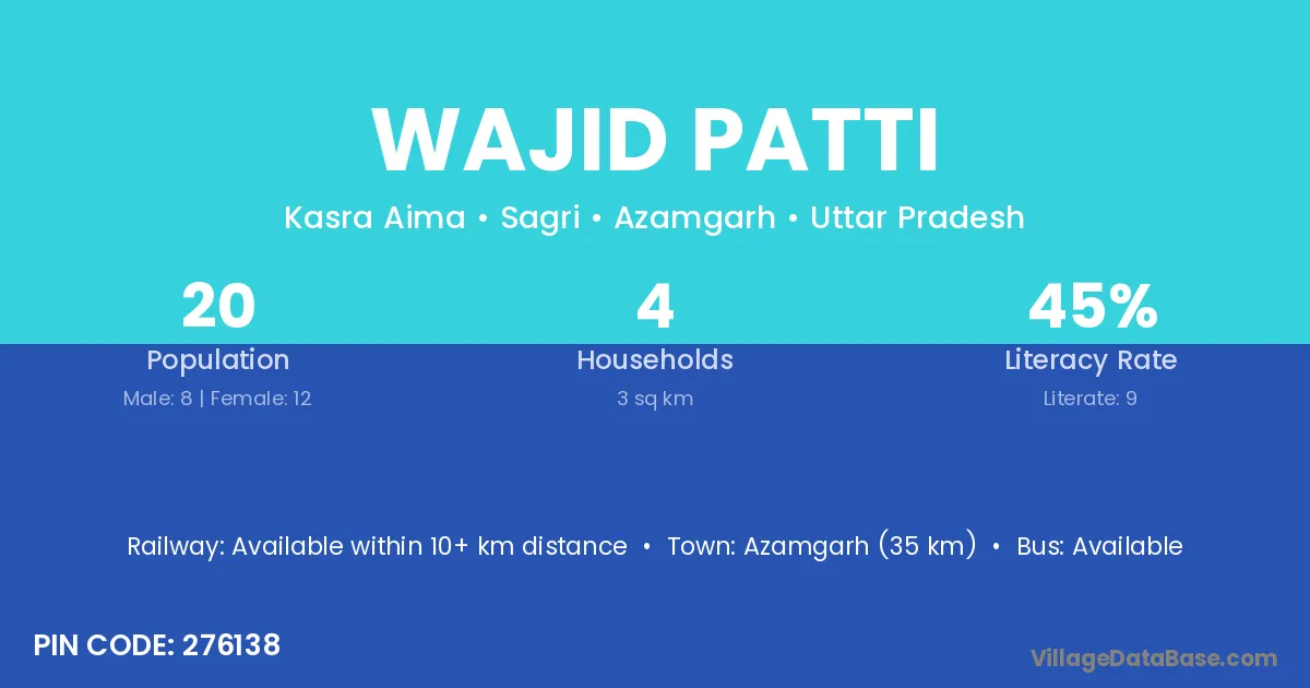 Azamgarh (35 km) is the nearest town to Wajid Patti village for major economic activities and is located approximately 35 km away.